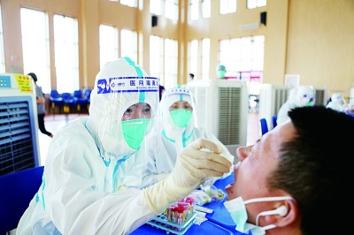 2021年中秋假期期间,在福建省泉州晋江市陈埭镇第五实验小学涵口校区,晋江市中医院护士在为附近村民进行核酸采样。新华社发