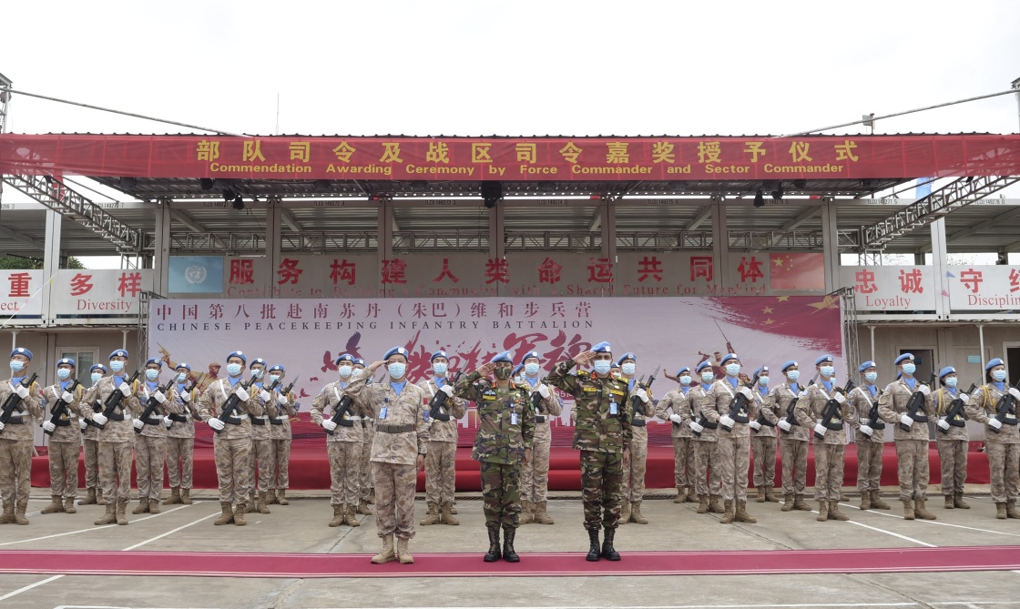 联合国驻南苏丹特派团(联南苏团)部队司令乔杜里少将与朱巴战区司令拉赫曼准将11日向中国赴南苏丹(朱巴)维和步兵营105名官兵颁发“司令嘉奖”,以表彰他们在执行联合国维和任务中作出的杰出贡献。这是8月11日拍摄的嘉奖授予仪式现场。新华社发(林家鑫 摄)