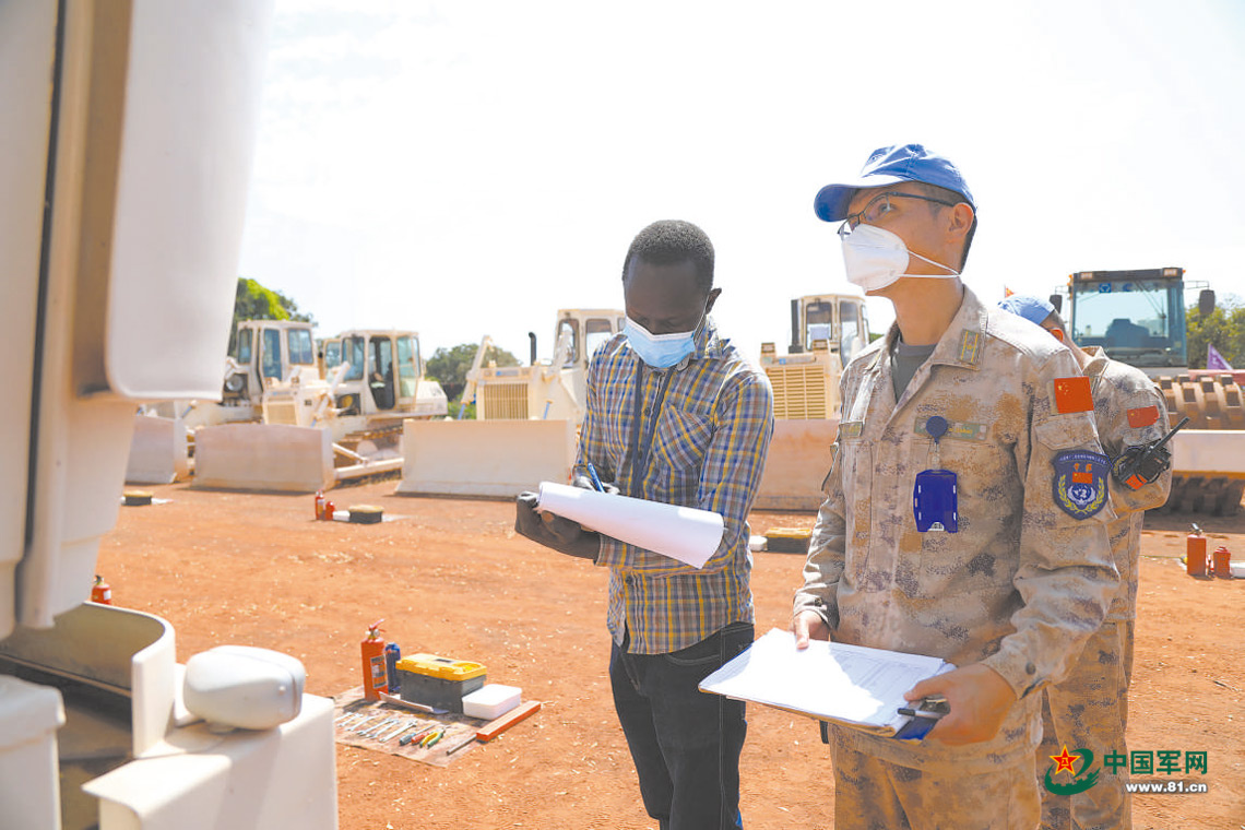 近日,中国第12批赴南苏丹维和工兵分队高标准通过联合国装备核查。图为核查官核对车辆情况。范 恒 摄