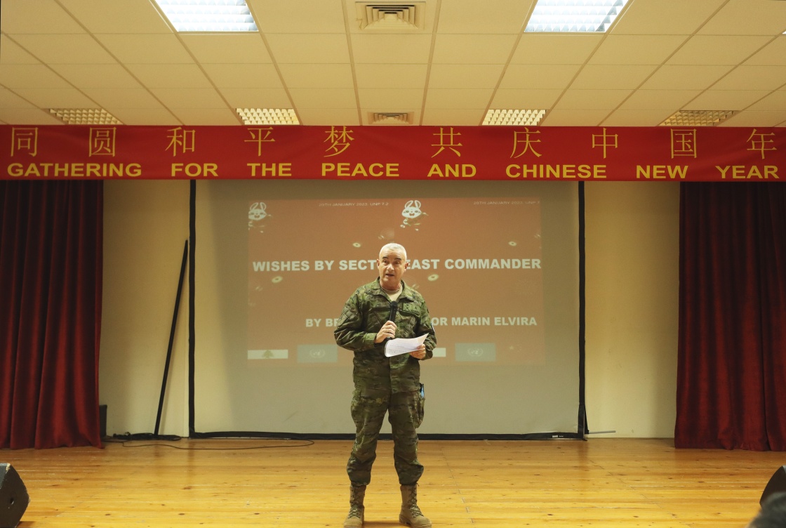 联黎部队东区司令梅尔乔将军以及来自西班牙、塞尔维亚、萨尔瓦多、柬埔寨、印度尼西亚、巴西、法国等9个出兵国500余名外国官兵和当地友人,与中国维和官兵欢聚一堂,互道新春祝福,共祝中国农历新年的到来。