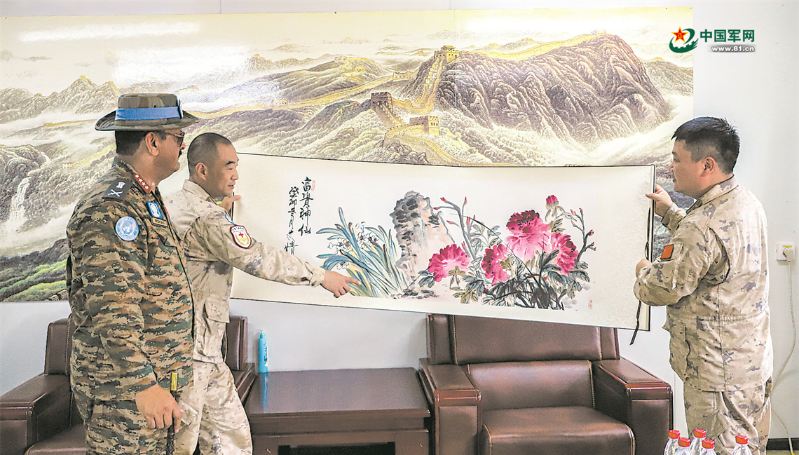 近日,联南苏团部队司令莫汉·萨布拉马尼安视察我第14批赴南苏丹(瓦乌)维和医疗分队,称赞分队官兵高效执行医疗保障和应急救援等任务。视察结束时,分队向莫汉赠送展示中国传统文化的书画作品。王皓宇 摄