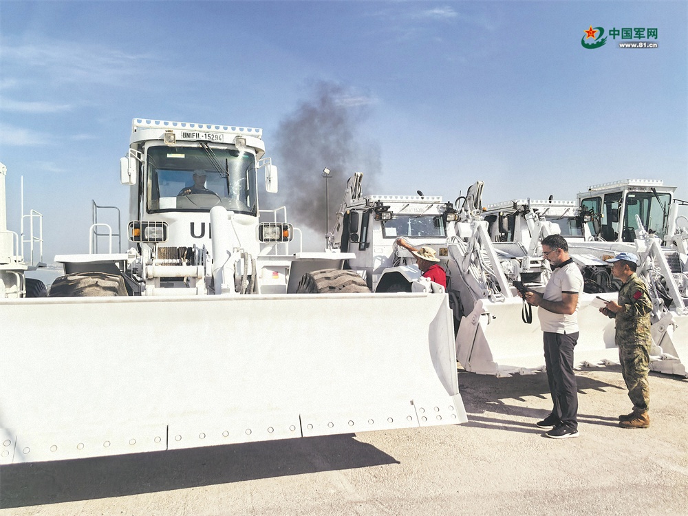 近日,中国第23批赴黎巴嫩维和部队建筑工兵分队和多功能工兵分队高标准通过联合国第四季度装备核查。图为核查组核查工程装备。 蔡新鹏 摄