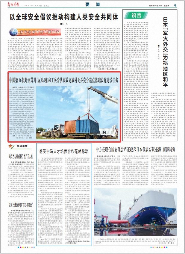 解放军报讯 史翰林、特约记者王轶报道:近日,中国第16批赴南苏丹(瓦乌)维和工兵分队高效完成科瓦乔克分遣点岗楼加固改造、营区道路平整、发电机房顶棚建设等基础设施建设任务,为后续更好执行维和任务奠定坚实基础。