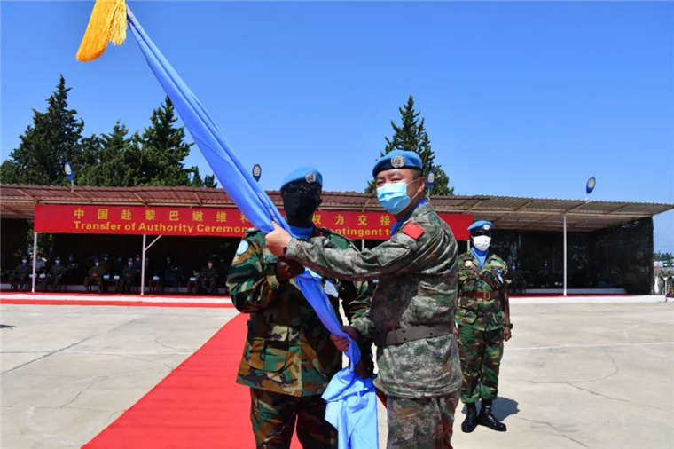 联黎部队副司令阿耶蒂准将检阅了身着星空迷彩的中国赴黎维和部队,从第18批赴黎维和部队指挥长高朝宁手中,接过联合国旗,郑重交予第19批赴黎维和部队指挥长杜嘉。