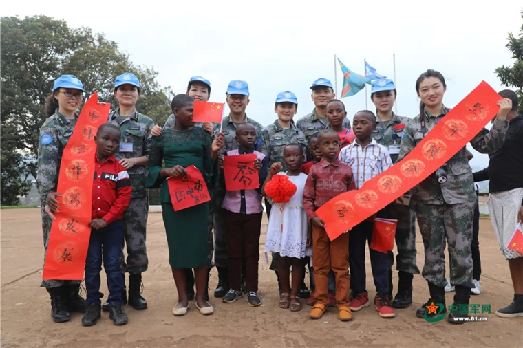 维和官兵与任务区内喜欢中国书法的非洲孩子们合影留念。吕强 摄