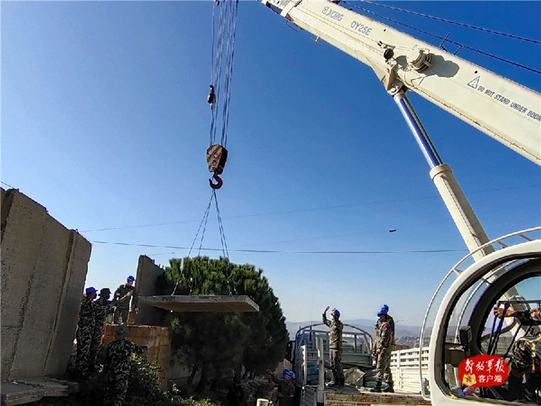 10月9日上午,在黎巴嫩南部边境东线联黎部队8-31尼泊尔营区,维和官兵与尼泊尔营官兵正在协同配合,对该营区1号观察哨进行最后的吊装封顶作业,前期已对7个观察哨进行了修复和加固等作业,这是该项任务的最后一个作业程序。