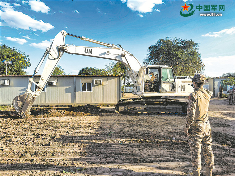 上图:我维和官兵操作装载机进行施工作业。肖永培摄