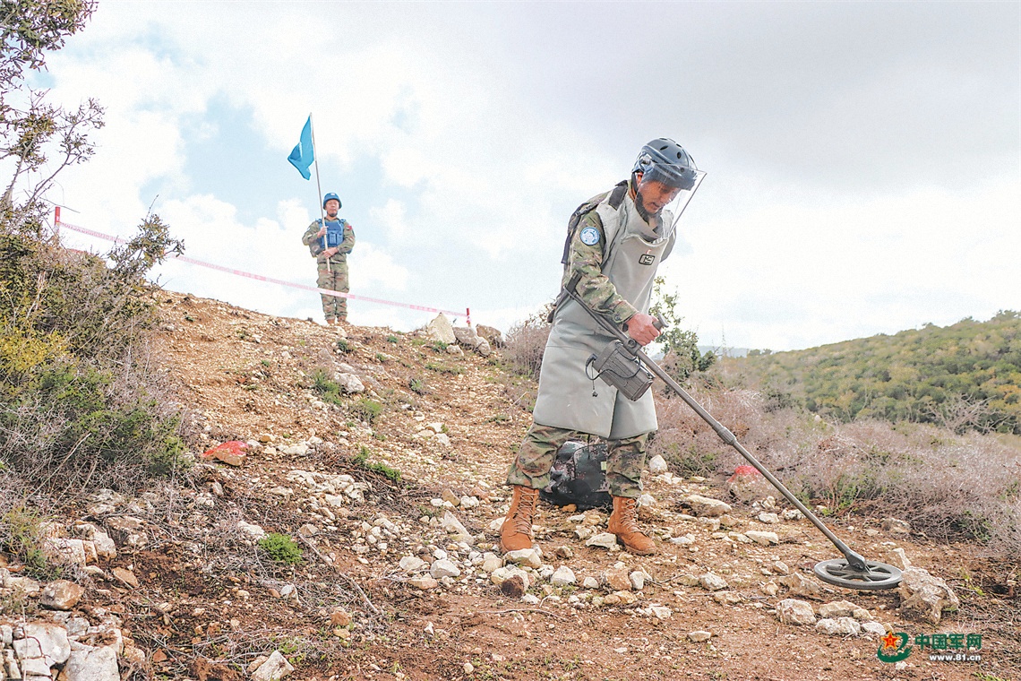 近日,中国第24批赴黎巴嫩维和多功能工兵分队官兵对黎以边境“蓝线”界桩进行维护,这是该批分队部署至任务区后首次执行此项任务。图为探测员为官兵开辟安全通道。瞿发统摄