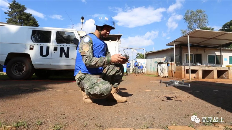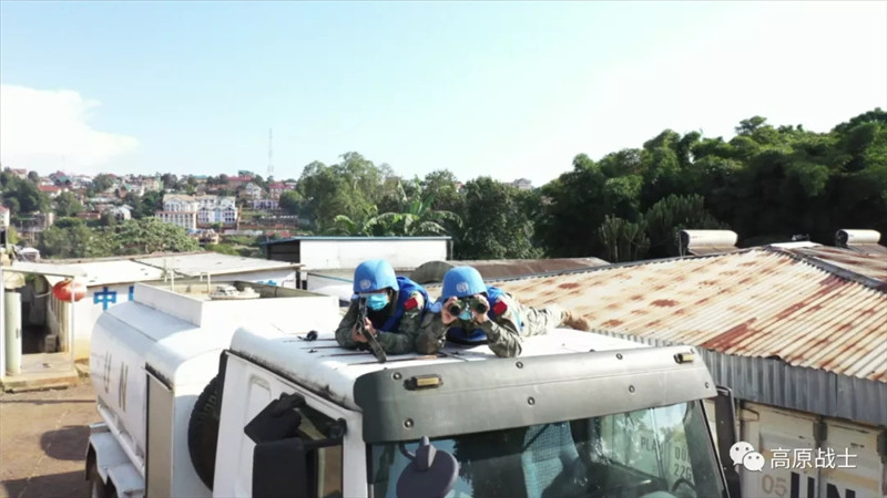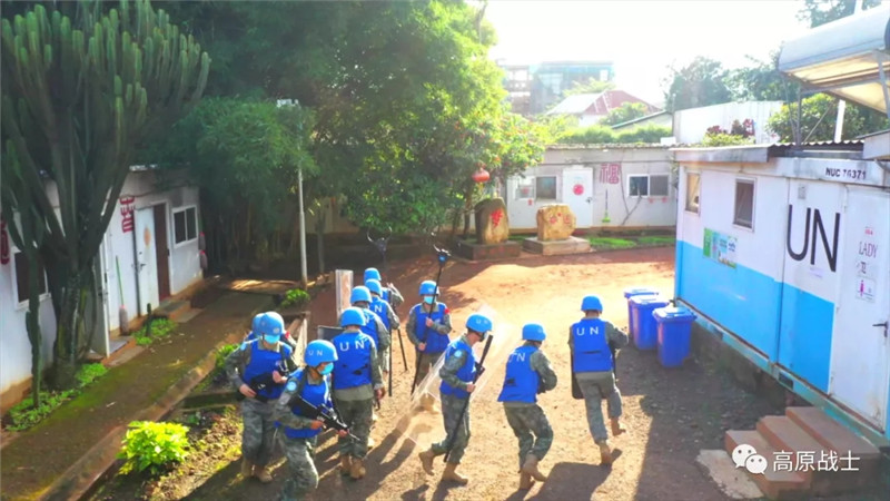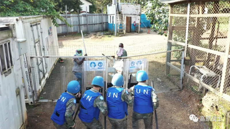 分队指挥组依据预案行动,所属人员第一时间穿戴防护装具,请领武器装备并到达指定地域,联络官立即向(联刚稳定团)南部战区报告情况并请求支援,4个处突小组在领取枪弹、盾牌等防卫武器装备后迅疾奔赴营区的各个出入口进行警戒,侦查小组占领制高点进行观察,无人机升空对驻地周边情况进行侦察监视。