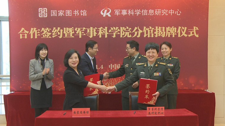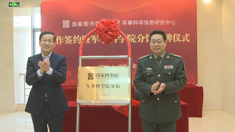 4月19日上午,在世界读书日即将到来之际,军事科学信息研究中心、国家图书馆签署合作协议,依托军事科学院图书馆设立国家图书馆军事科学院分馆,并举行揭牌仪式。