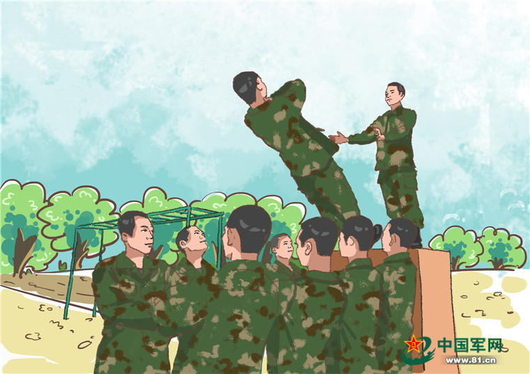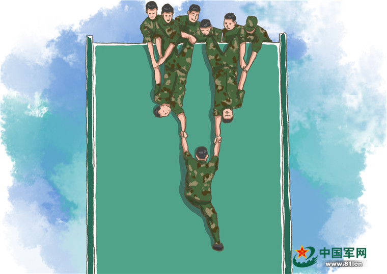 4米高的障碍物该怎么越过?兵哥哥们自有办法。他们手拉手,肩并肩,竖起高高的人墙,用身躯将一名名战士送上去,上下协作配合攻破这个看似不可占据的“制高点”。