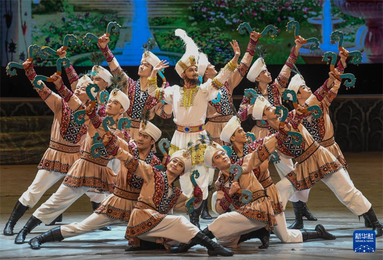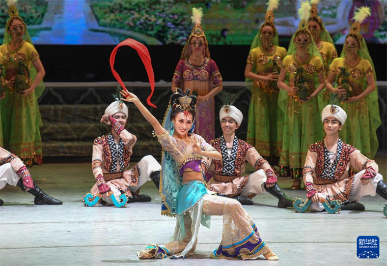 当日,经典舞剧《丝路花雨》在新疆乌鲁木齐京剧院演出,吸引不少观众。