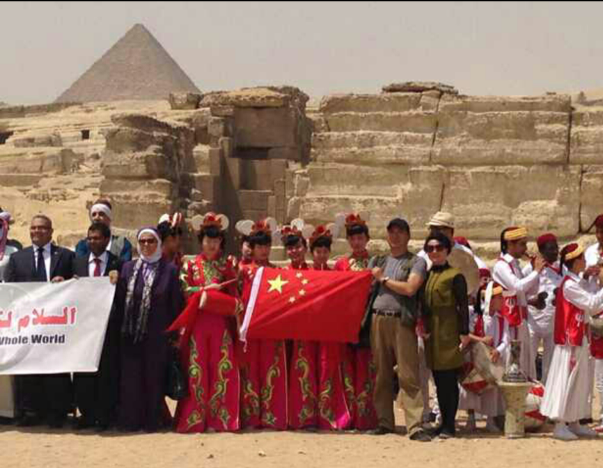 鹰扬舞蹈艺术团在埃及金字塔下展现国旗,接受国内媒体采访。