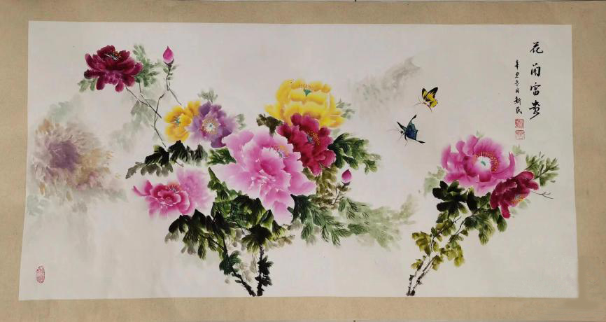 贾新民还善长画牡丹和兰草。这两个系列一画就是二十多年。贾新民笔下的牡丹,细腻淡雅,姹紫嫣红,雍容华贵,国色天香。观其画便让我想起唐代诗人李正封对盛开牡丹花的赞美:国色朝酣洒/天香夜染衣/月景春醉容/明月问归期/。贾新民的应景画有很多,而且他的画风都是追求古风之多,他所画的兰草惊世骇俗,用笔狂放,所画兰草或隐于石竹之间,或展于画前,生机盎然,具有古代赵孟頫、徐渭等名家风范,也让我感受作者的钢筋铁骨。