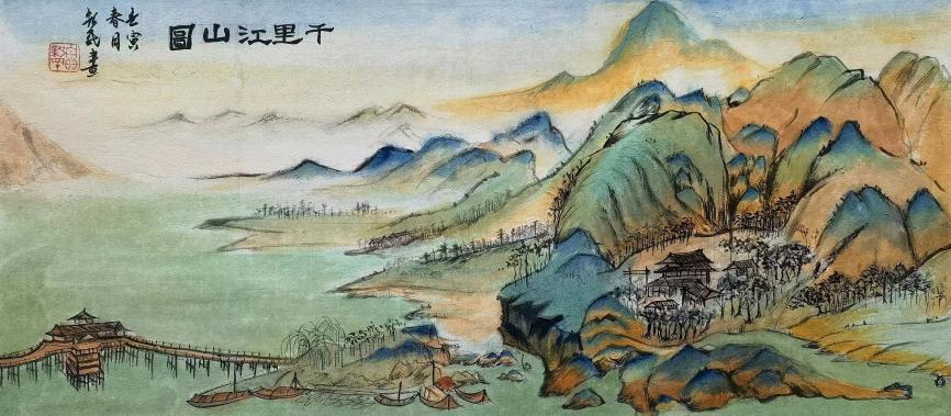 贾新民临宋代大师王希孟著名青墨山水《千里江山图》局部之二。
