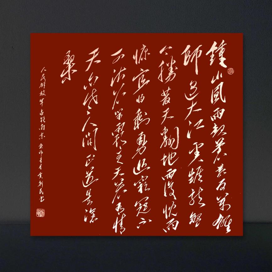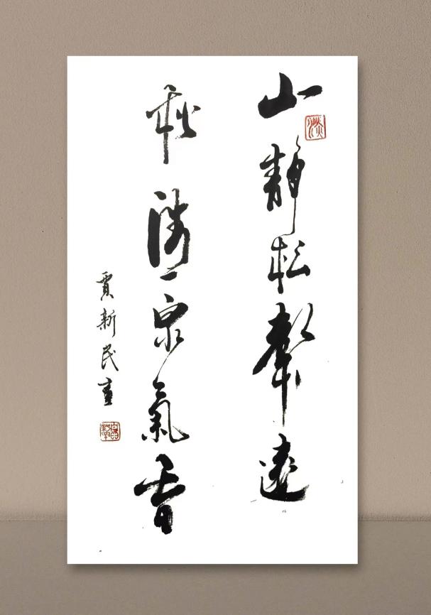 贾新民自幼习书,书法艺术功底丰厚扎实。楷书从颜入手,法度严谨,字迹秀逸;隶书取法汉碑,用字宽绰,笔力遒劲;行书习二王之风,节奏流畅,韵律灵动;草书气质磅礴,潇洒自如。总之,贾新民的书法作品有"心力"与"笔力"和"舞蹈"融合妙用而产生的艺术"张力"。