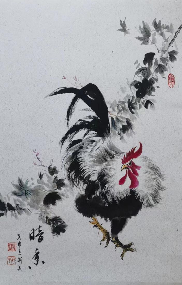 画鸡是贾新民的绝活,从小画到老。在一张宣纸上,他下笔如神,七勾八拐几点水墨,便把这种家禽的神态气质和报晓天性展现的淋漓尽致,真是应了明代唐寅那首"头戴红冠不用裁/满身雪白走将来/平生不敢轻言语/一叫千门万户开/的诗意。