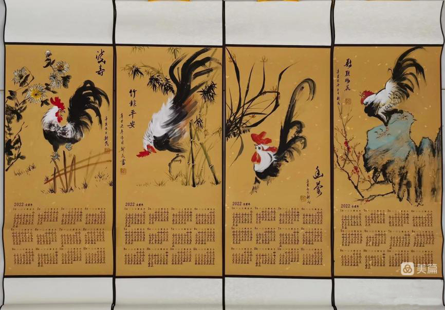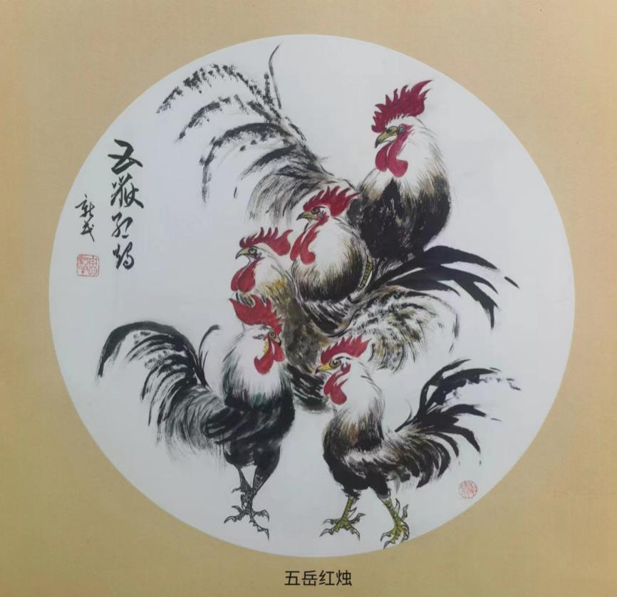 贾新民创作的《五岳红烛》。五鸡图注释:公鸡,中华人民共和国版图;五岳,三山五岳;红烛,又拟红旗;诠释,祖国山河一片红。