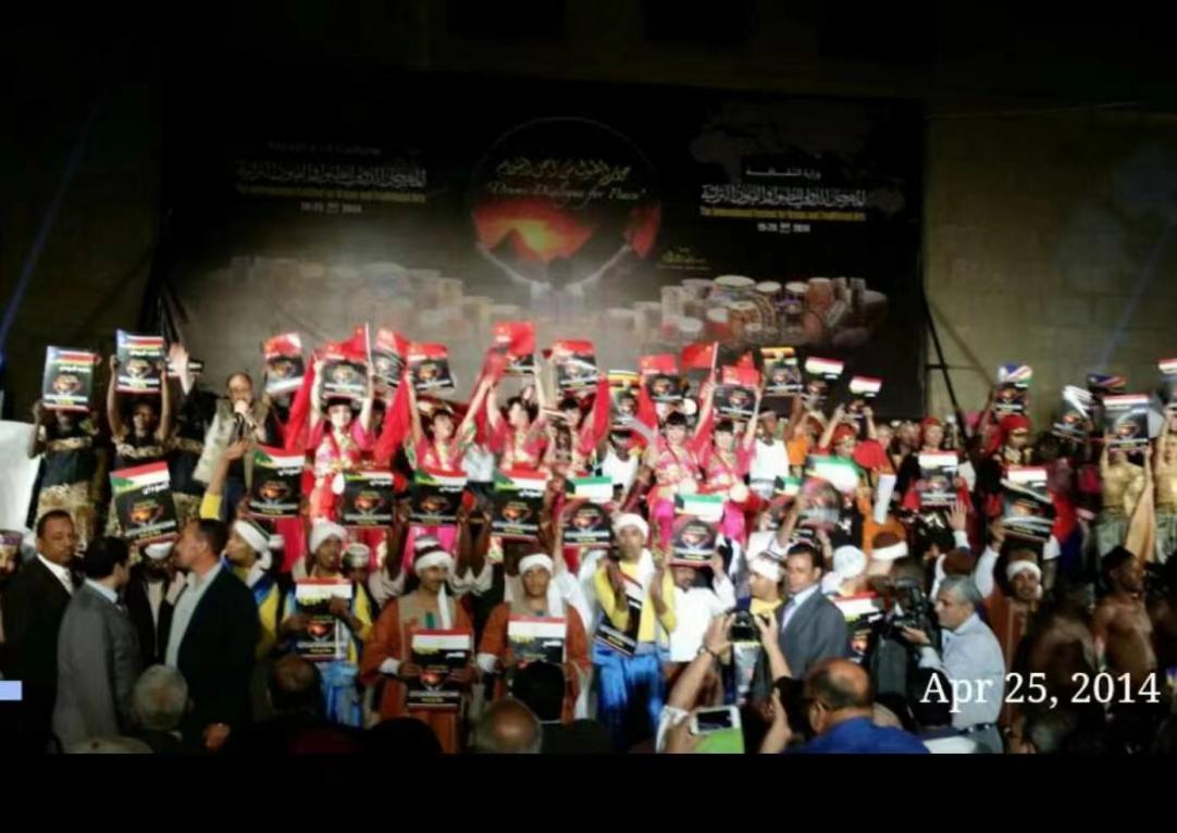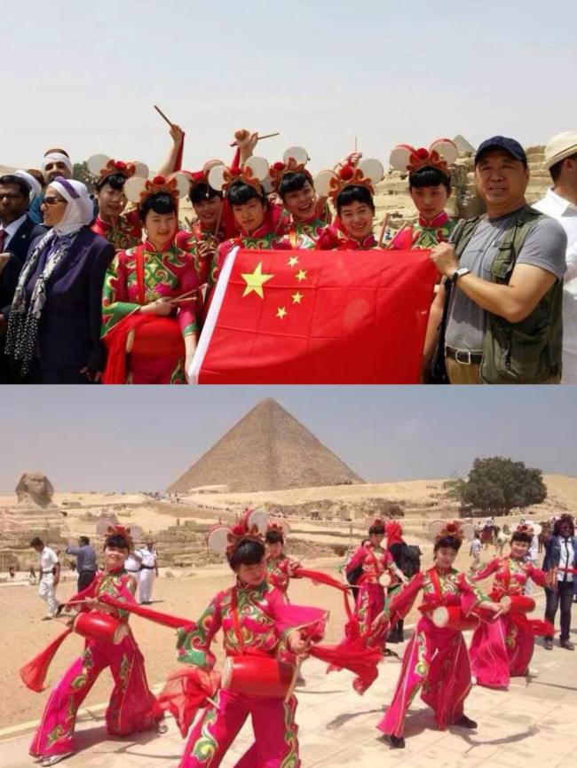 贾新民、张静率鹰扬舞蹈艺术团参加埃及国际鼓舞节,演员们在金字塔下表演舞蹈《腰鼓舞》。