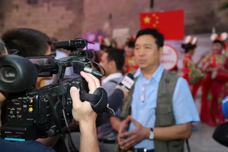 受国家文化部委派参加埃及国际鼓乐节,贾新民接受媒体采访。
