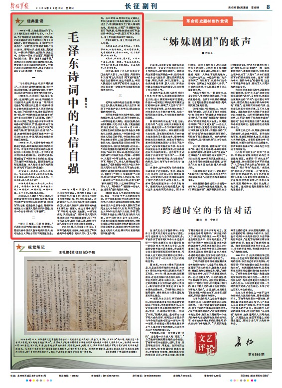 “为有牺牲多壮志,敢教日月换新天”。毛泽东诗词中的自信自强,有对中国人民掌握自己命运的坚定信念,有对中国人民改造中国社会的伟力的深情礼赞。