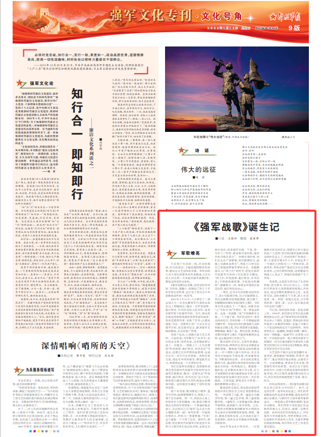 《强军战歌》这首歌,虽然创作时间短、写作快、篇幅小,却调动了我几十年的军营生活积累,也引发了我对当今军旅歌曲创作的一些思考。