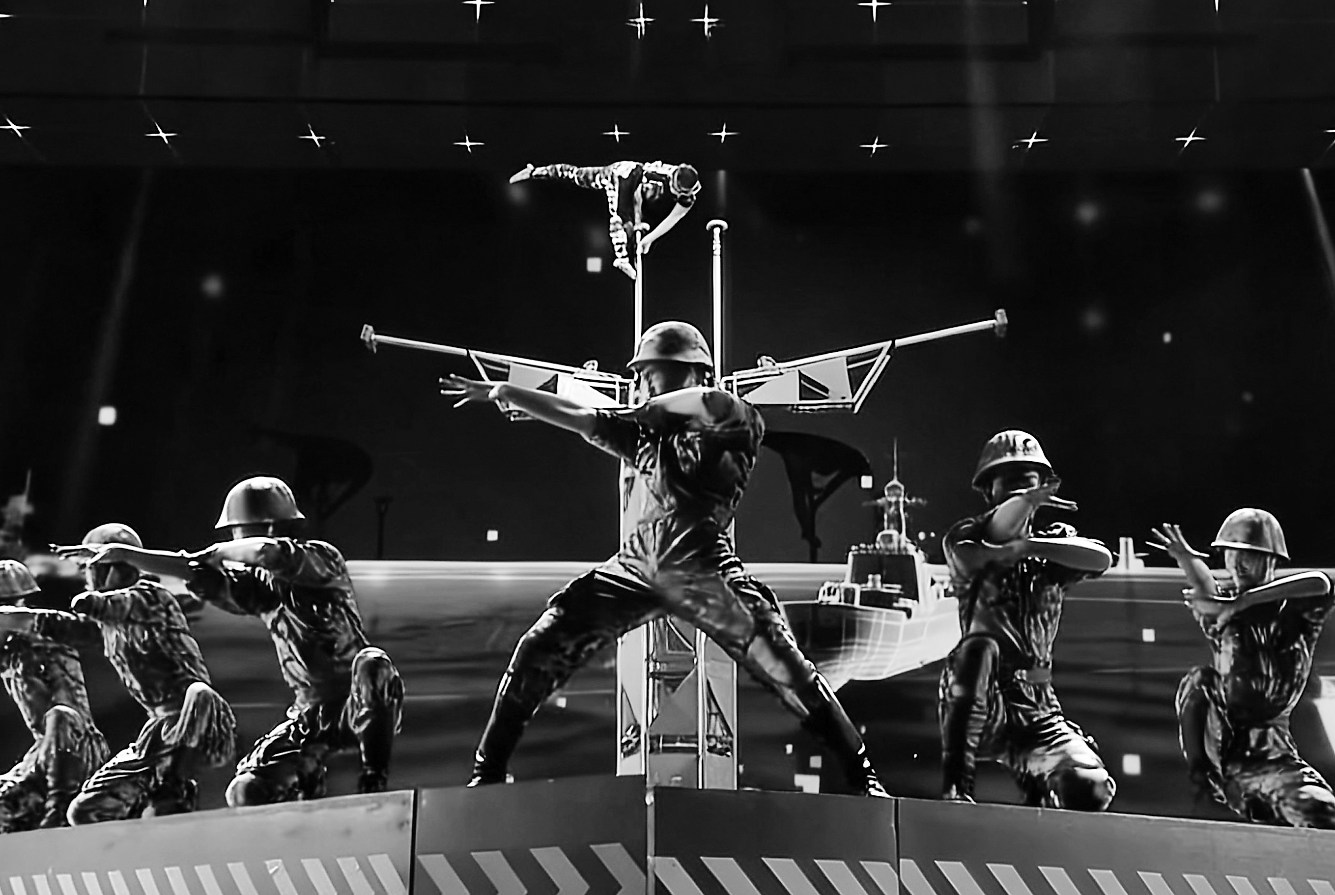 2018年春晚节目杂技与舞蹈《沙场砺兵》剧照。