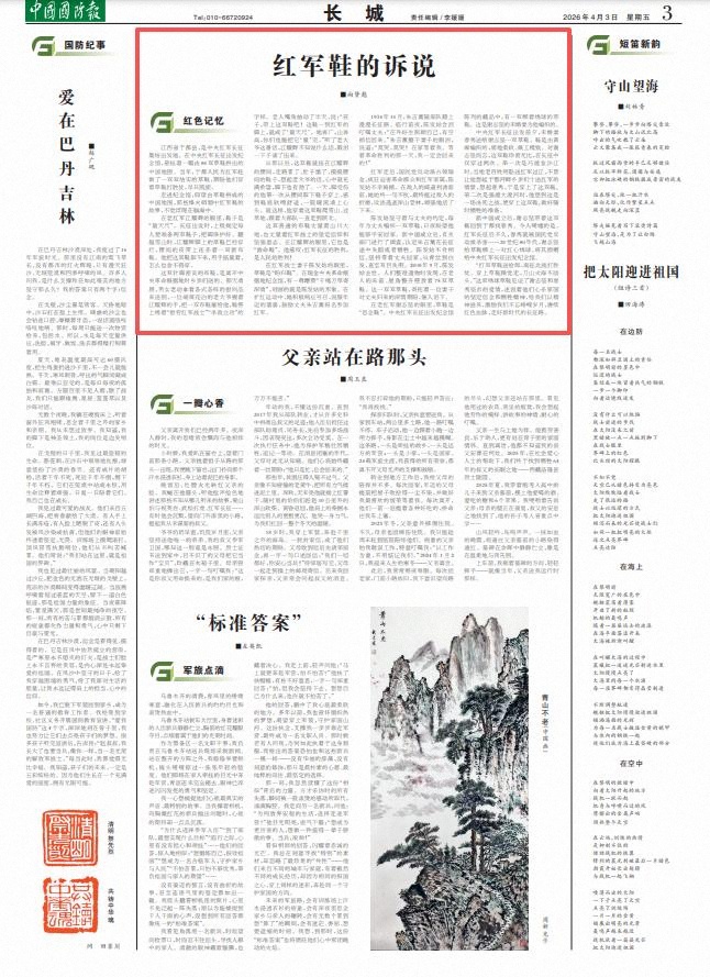 这双针脚密实的布鞋,是离开中央革命根据地时乡亲们送的。那天清晨,男女老幼拿着各式各样的慰问品来送别,一位胡须花白的老大爷握着江耀辉的手,把一双布鞋塞给他,鞋帮上绣着“慰劳红军战士”“杀敌立功”的字样。老人嘴角抽动了半天,说:“孩子,带上这双鞋吧!这鞋一到红军的脚上,就成了‘量天尺’。地再广,山再高,你们也能把它‘量’完。”听了老大爷这番话,江耀辉不知说什么话,眼泪一下子涌了出来。