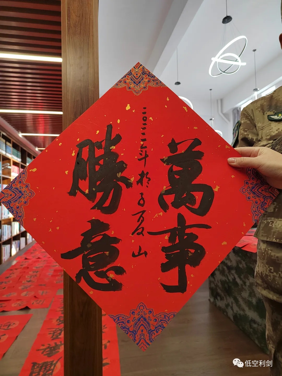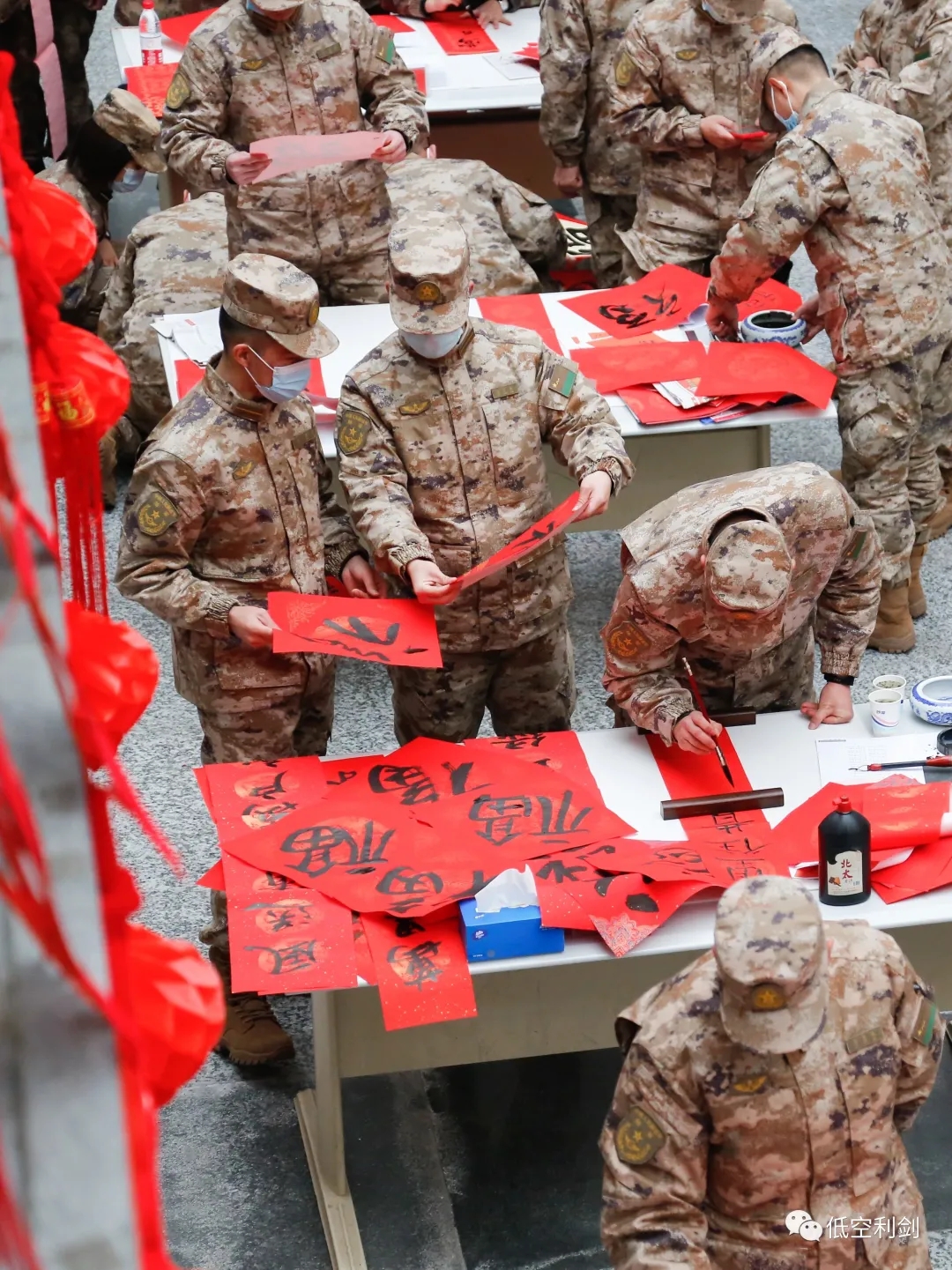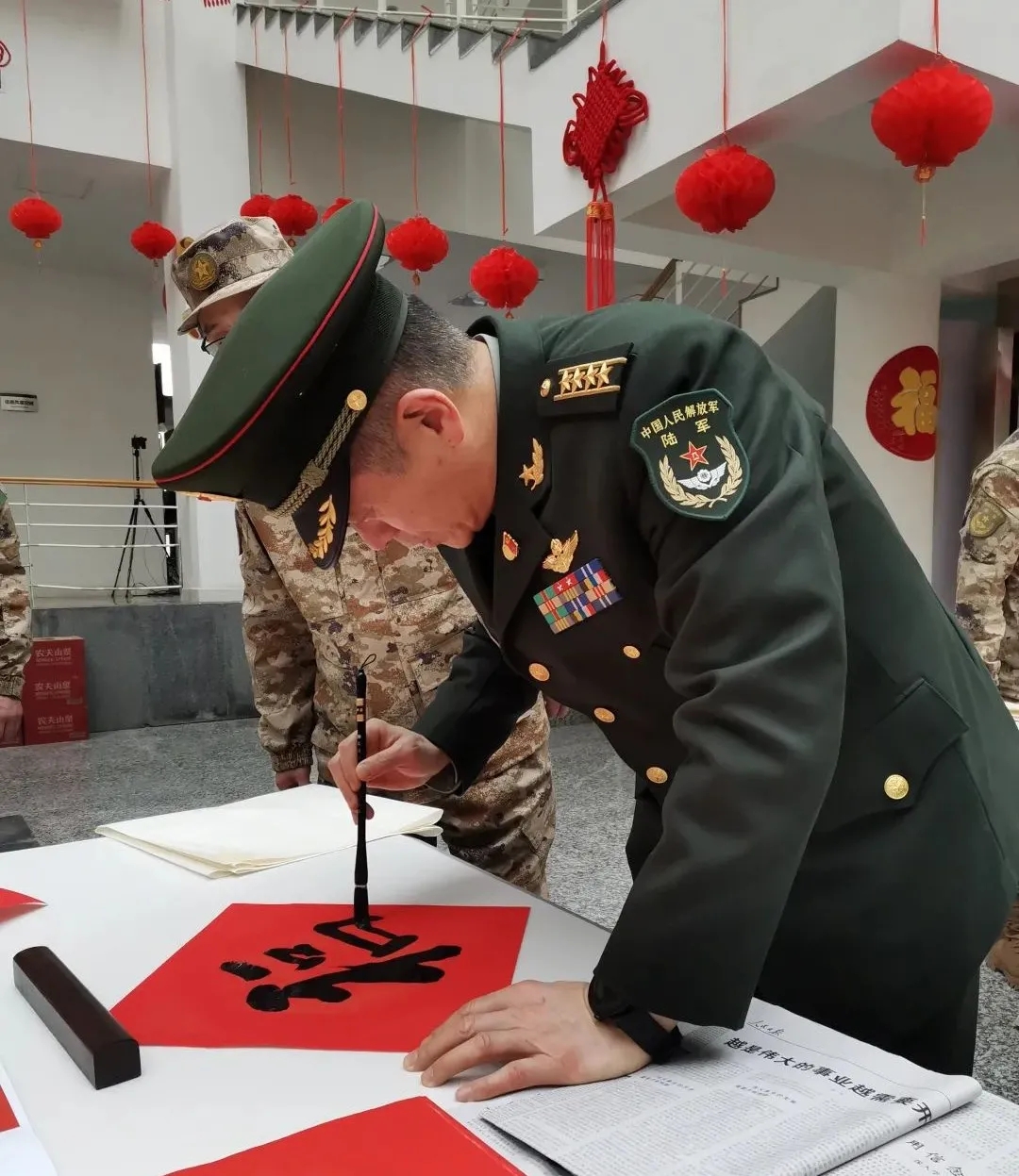 ▲解放军总医院京东医疗区主管技师孙立美同志为官兵题写春联