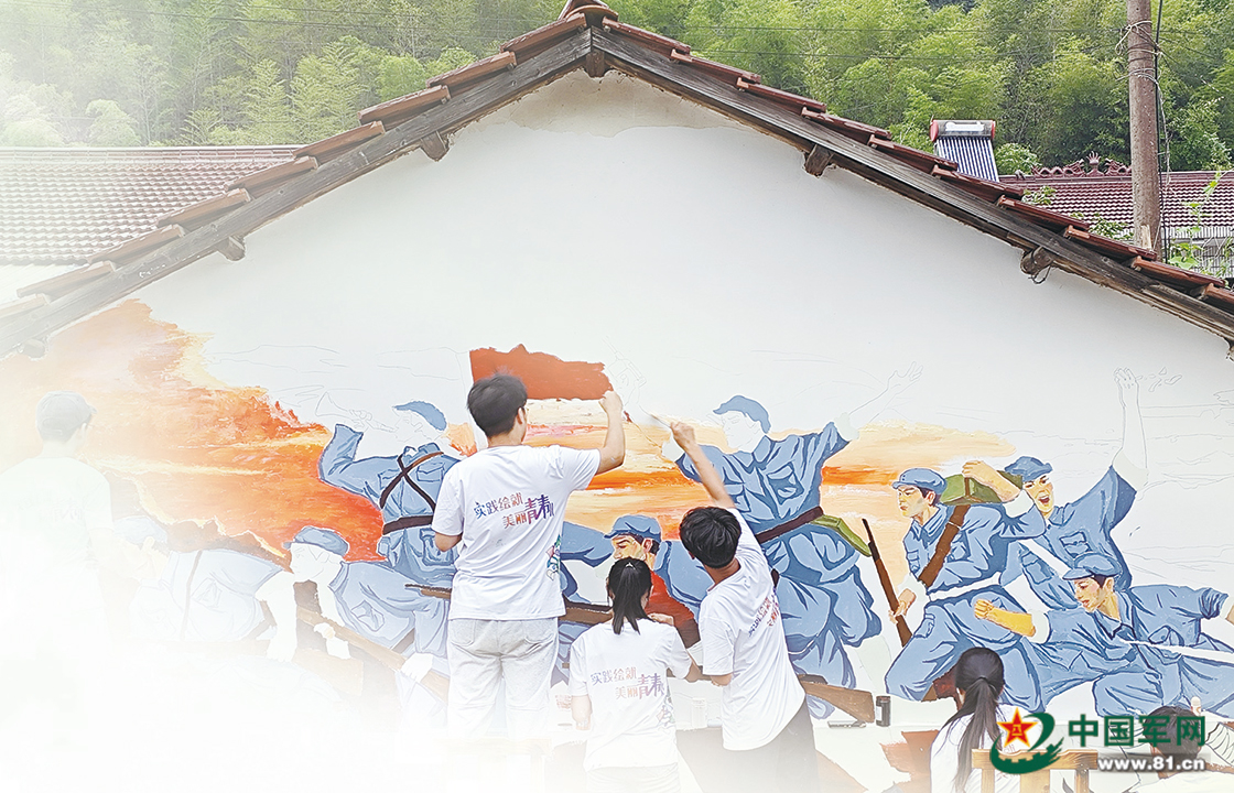 工作室志愿者在宣城市溪口镇吕辉村绘制红色文化墙绘。