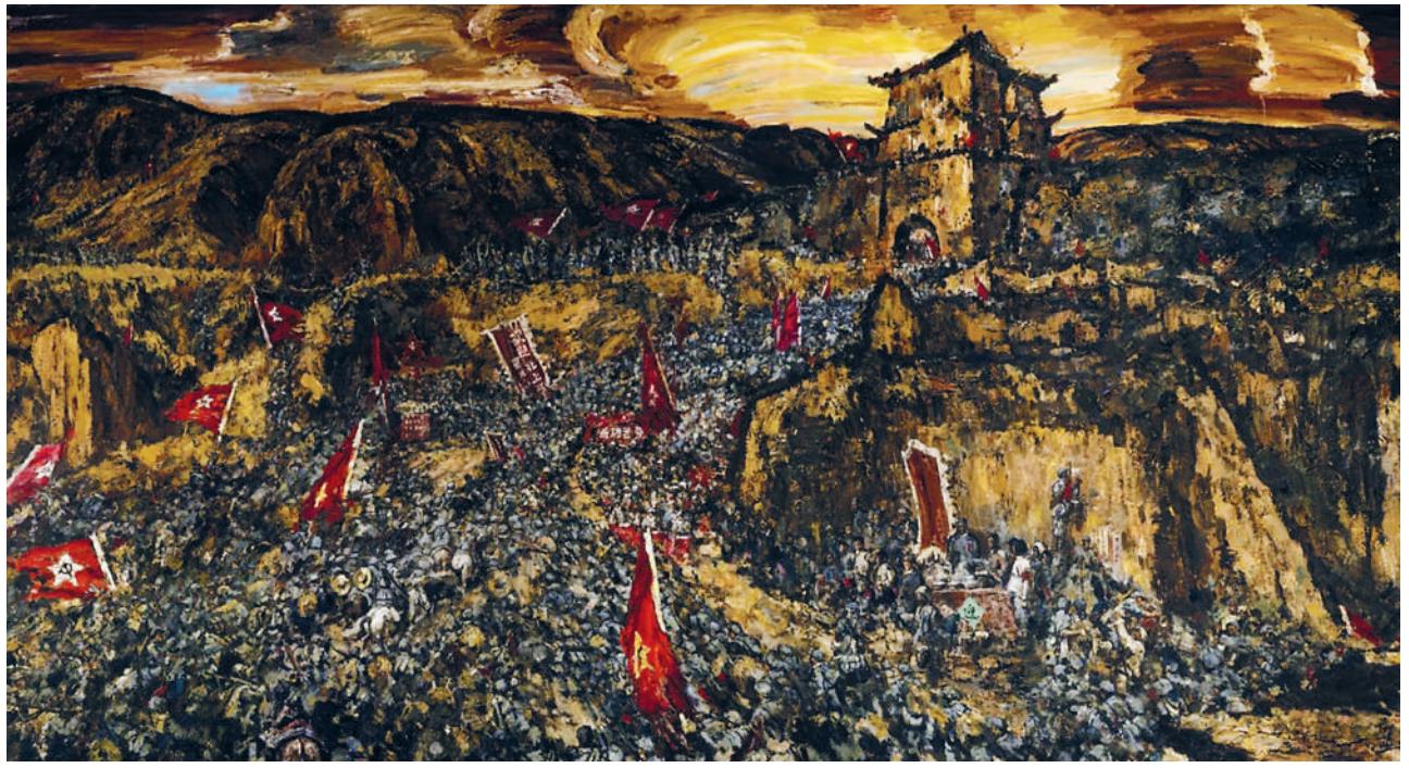 1936年10月,红军三大主力成功会师标志长征胜利结束。画家陈树东以此为背景,创作了油画作品《三大主力红军会师》。作品入选“建党100周年大型美术创作工程”。该作品以黄土高原特有的土黄色系为基调,采用大笔触塑造形象,将视点聚焦在画面氛围和气势上,强调了大众的力量,在历史真实与艺术真实之间找到了诗意再造的空间。图文整理:常佳婕