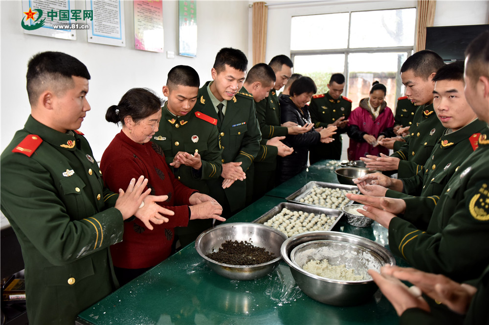 官兵与大妈边包汤圆边话家常,喜笑颜开。