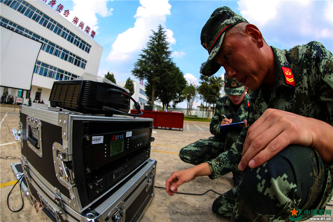 参赛官兵进行架设野战卫星电视课目考核。胡程摄