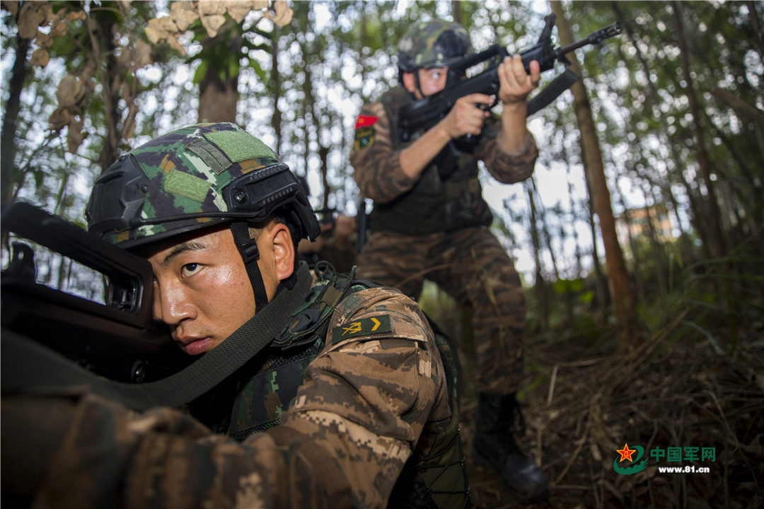 小组战术训练课目中,一名特战队员掩护队友搜索前进。