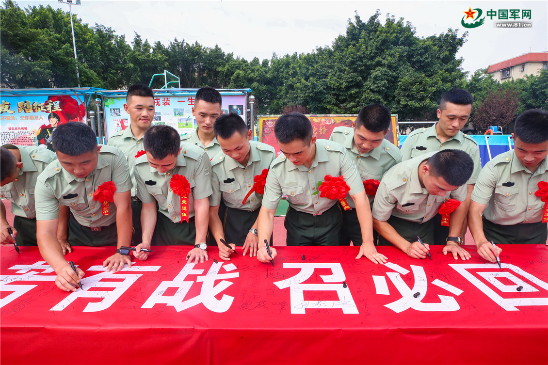 退伍老兵在“若有战 召必回”横幅上签下姓名。