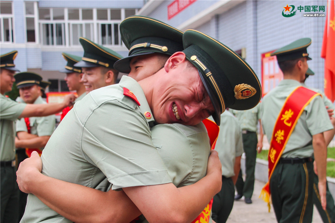 退役老兵与留队战友挥泪话别。
