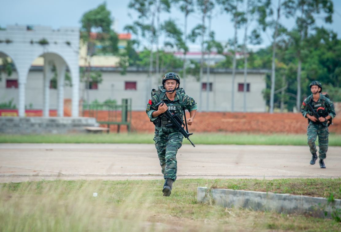 武警特战队员正在进行2公里武装越野射击训练。
