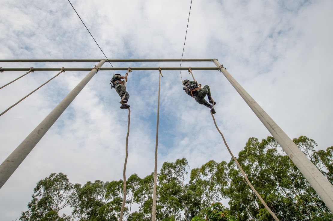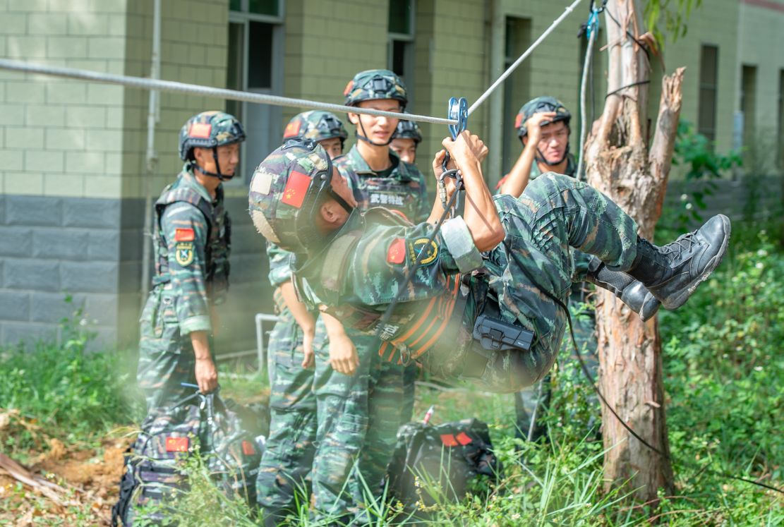 武警特战队员正在进行攀登训练。
