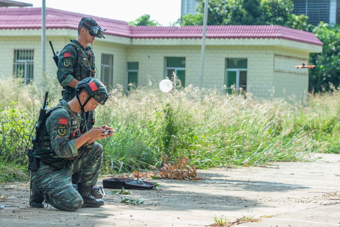 武警特战队员正在进行无人机引导打击训练。