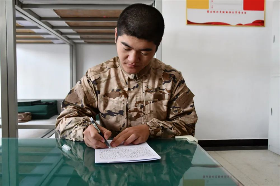 新兵赵娅霓:古有木兰,报国安邦,女扮男装战沙场。如今的我,也穿上了这身军装,我感到很荣幸和光荣,这里的一切对我来说都是全新的,但请爸妈放心,我定能坚持到底,突破困难,让自己变得更加优秀。