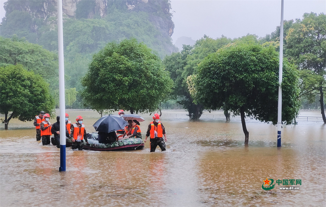 近日,受连续强降雨影响,广西桂林市多地相继遭受不同程度洪涝灾害,其中该市七星区英才小区等地遭湖水倒灌,驻地群众生命和财产安全受到威胁。6月5日4时许,武警广西总队桂林支队官兵经请示获批后,火速派出20余名官兵,携带救援装备深夜驰援受灾地区。