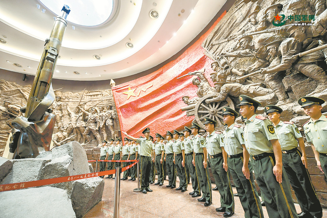 “那声震撼寰宇的枪响,宣告了新型人民军队的诞生……”“石破天惊”雕塑前,官兵们认真感悟那段艰苦卓绝的光辉岁月。