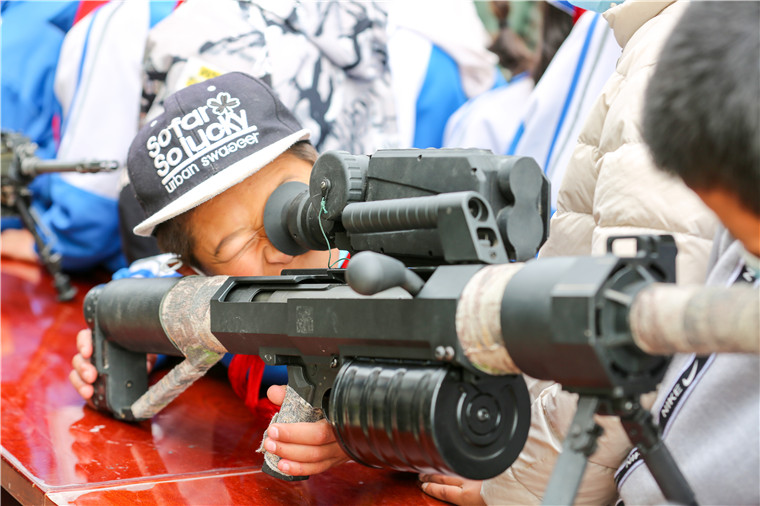 一件件武器装备吸引师生们驻足参观,通过解说员讲解,学生们跃跃欲试,一双双稚嫩的双手举起钢枪,沉甸甸的钢枪也让“祖国的未来”感受到了保卫国家的重量。