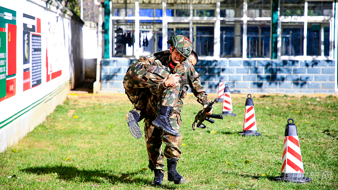 武警河南总队新乡支队官兵正在进行救护组合训练。邢鹏展 摄