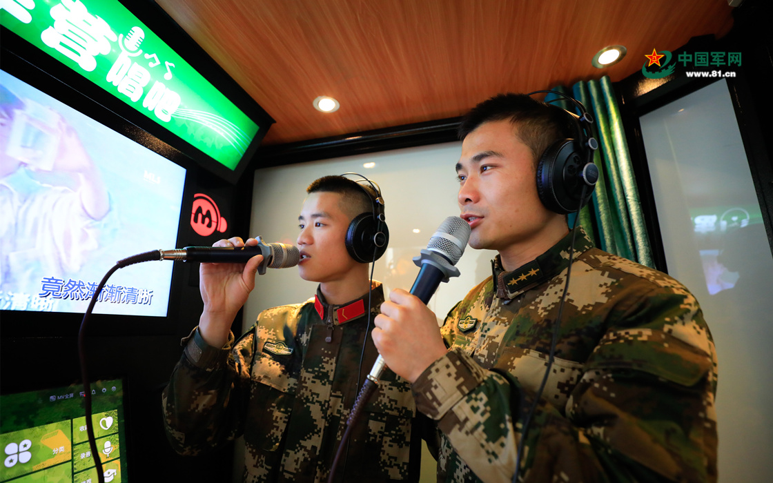 基层指导员与新兵在军营唱吧缓解压力。张松松 摄