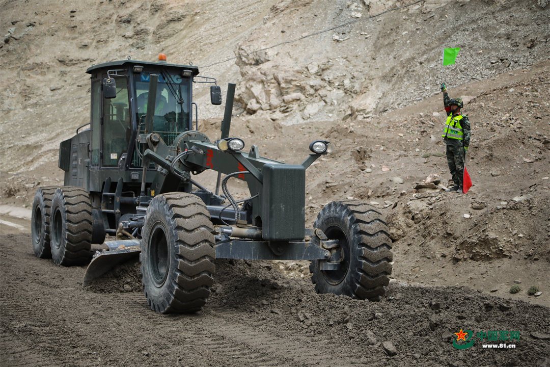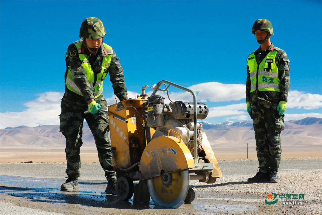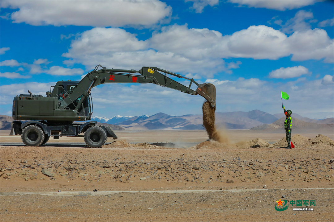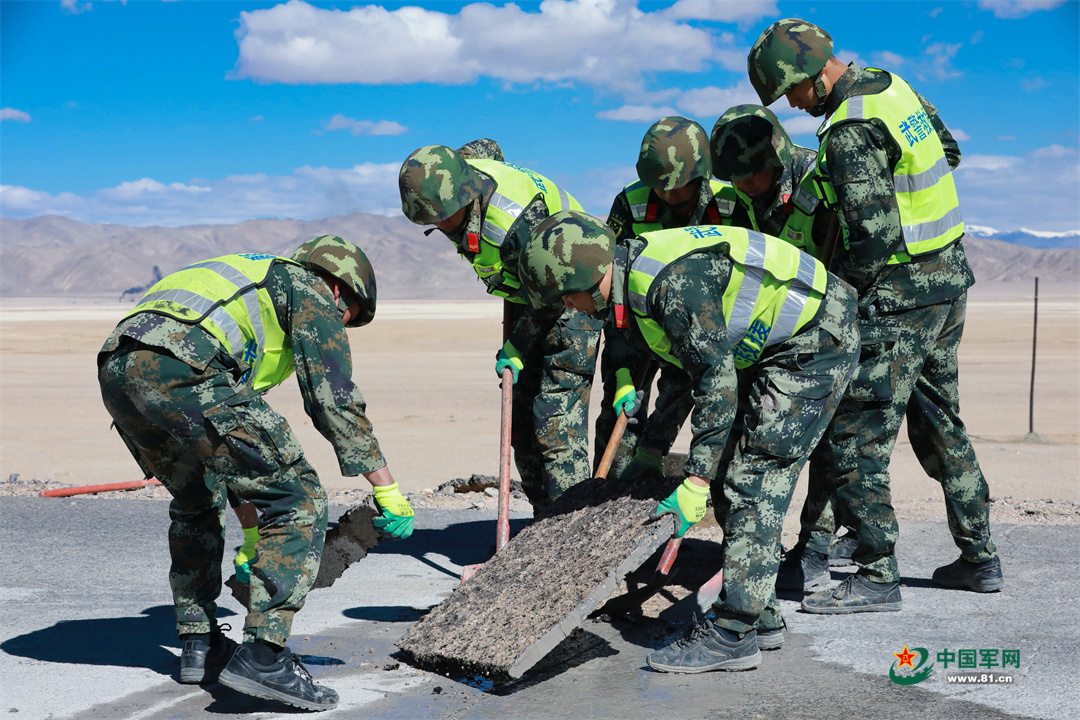 中午时分,紫外线异常强烈,伴随着狂风卷起的沙粒,打在脸颊阵阵作痛。在茫茫无人区,放眼望去只见官兵来回穿梭在天路的忙碌身影,挖掘机回填路基、装载机运送砂石料、平地机摊铺路面、压路机压实路基、沥青车烧制拌合沥青……官兵们井然有序,在各自战位各司其职,一段段损坏的道路随后就被修复一新。