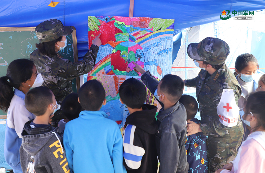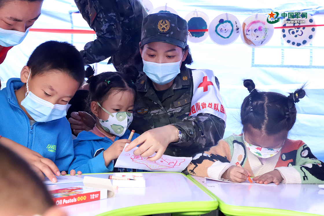 武警四川总队医院医学心理科主任王治告诉记者,“地震对每一个人心理都会有些冲击,尤其是幼儿他们不会表达,往往容易把这种负面的情绪积压在内心深处,我们通过绘画治疗,用画笔表达,用故事治疗,通过这种方式帮助这些年龄阶段孩子消除心理阴霾,整合对未来美好生活的信心,从而塑造积极健康心态……”