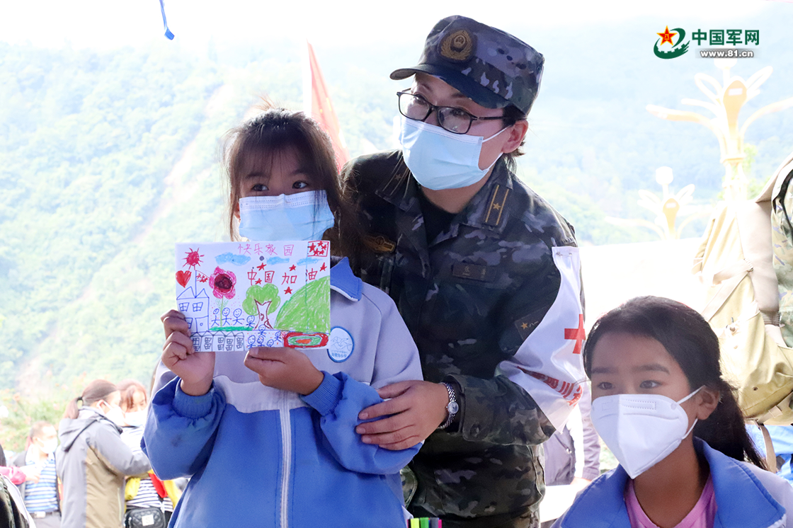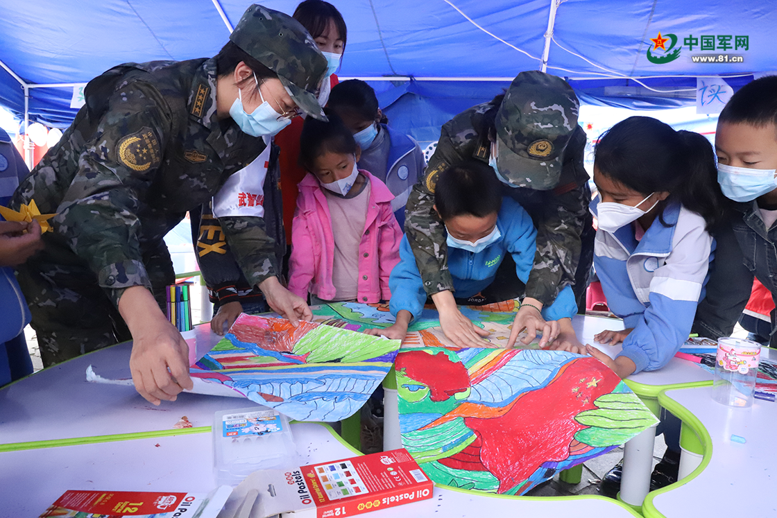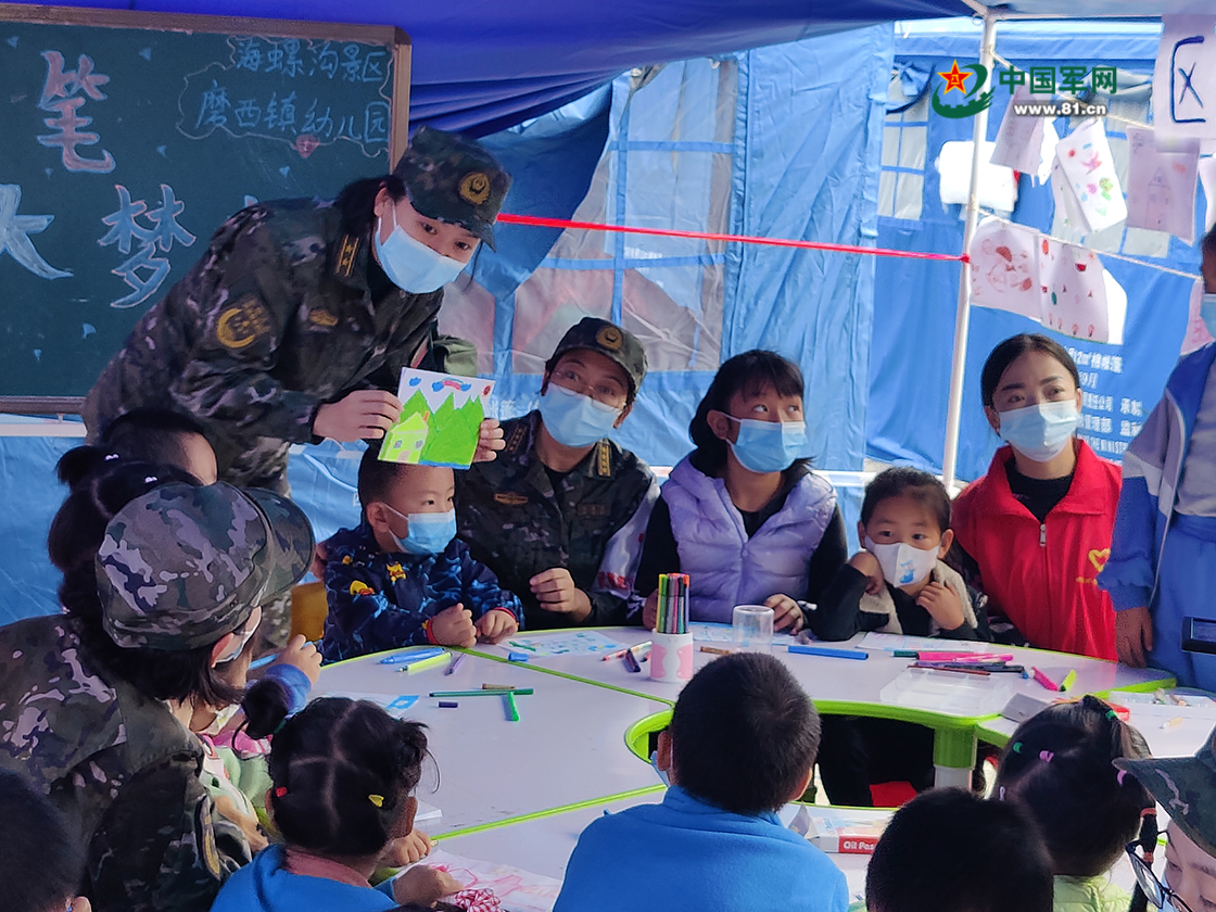 “我们今天的活动主要目的是帮助孩子消除地震对孩子们心里产生的阴霾。通过让他们绘画未来的美好家园,进行心理整合,帮助他们提升对未来生活的信心。我很意外,孩子们会说超级英雄是我们军人,是灾后军人的挺身而出在孩子们心理留下了深刻印象,所以他们会说长大后也要当超级英雄(军人)。”武警四川总队保障部卫生处负责人吕露说。