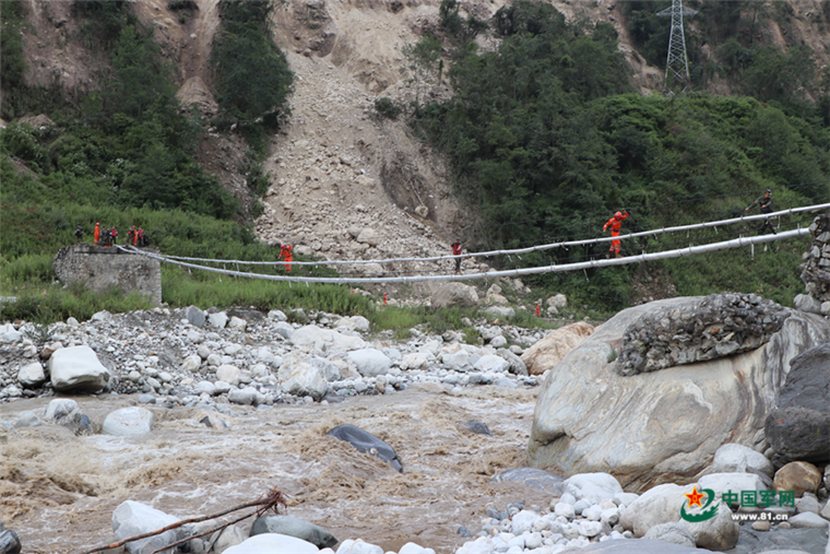 由于安全绳数量有限,副大队长王栎帏过河时,已经没有什么防护手段。行至半程,铁索猛地一晃,他心里一颤,“当时脑海中霎时闪过的就是自己七岁的孩子,这么湍急的水流,要是掉下去,肯定就‘光荣’了。”可想到前方还有等待救援的乡亲们,任务必须要完成。他抛开一切杂念,“华山一条路”,随着一步步向前挪,步子也愈加坚定。