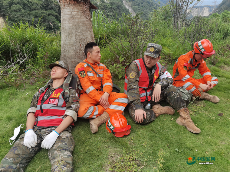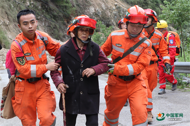 救援到达时,村民们恰好组织完毕准备转移。相遇时,许多老乡热泪盈眶,村民李霞说:“真的是那一刻眼泪就管不住了,就像是看到亲人。”听说乡亲们已经一天没吃饭,官兵们立刻拿出随身携带的食物送给受灾群众。回撤时,官兵们三人一组,或抬或背或扶,将当地的两百余名村民全部快速转移,途径危险地域时,官兵们都自觉把头盔让给老乡。在路边,记者与刚选晋下士的浦立荣擦肩而过,他满头是汗,一肩挎着两个背包,一手搀着一位老人,还不忘腾出手来替老人扇风降温。